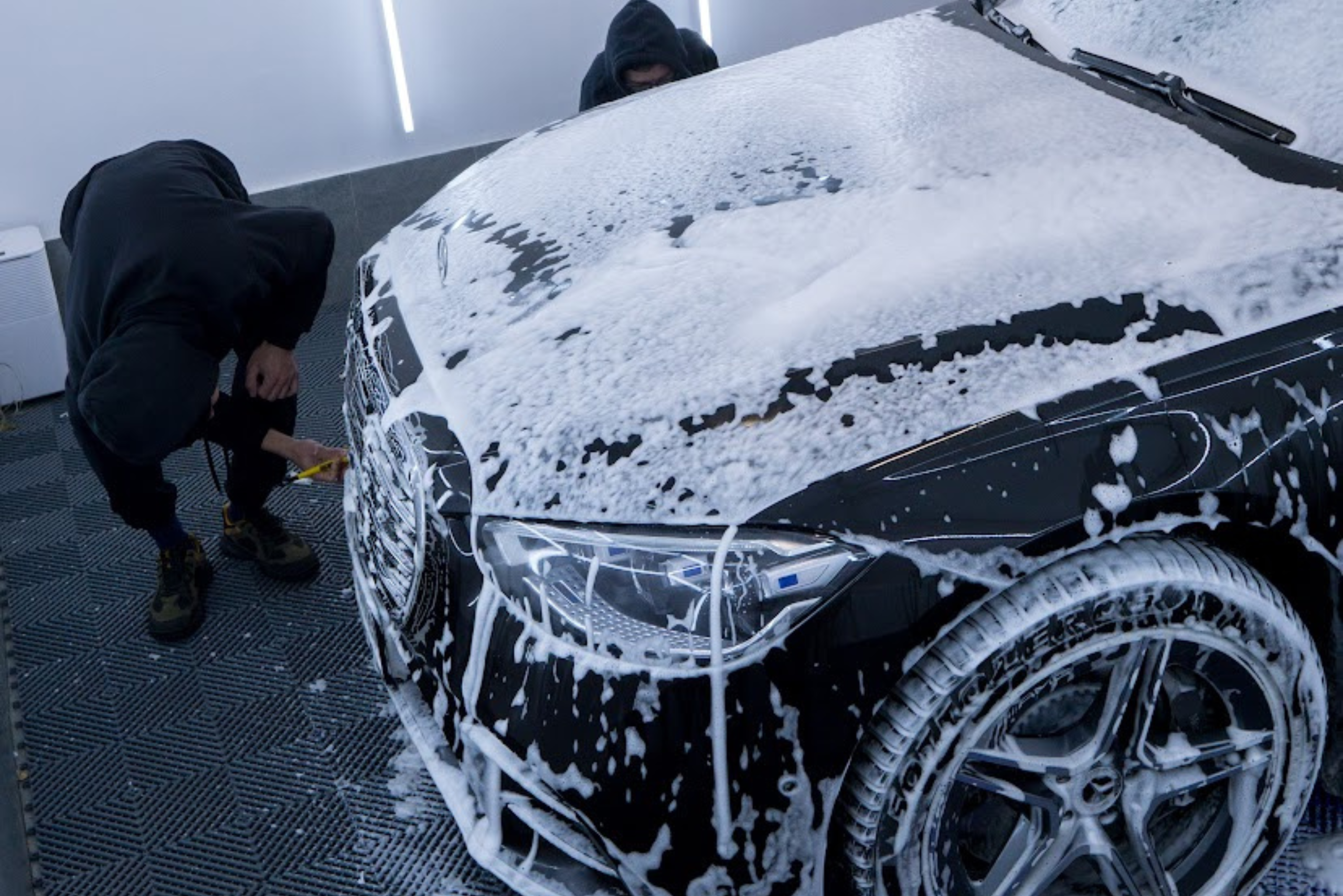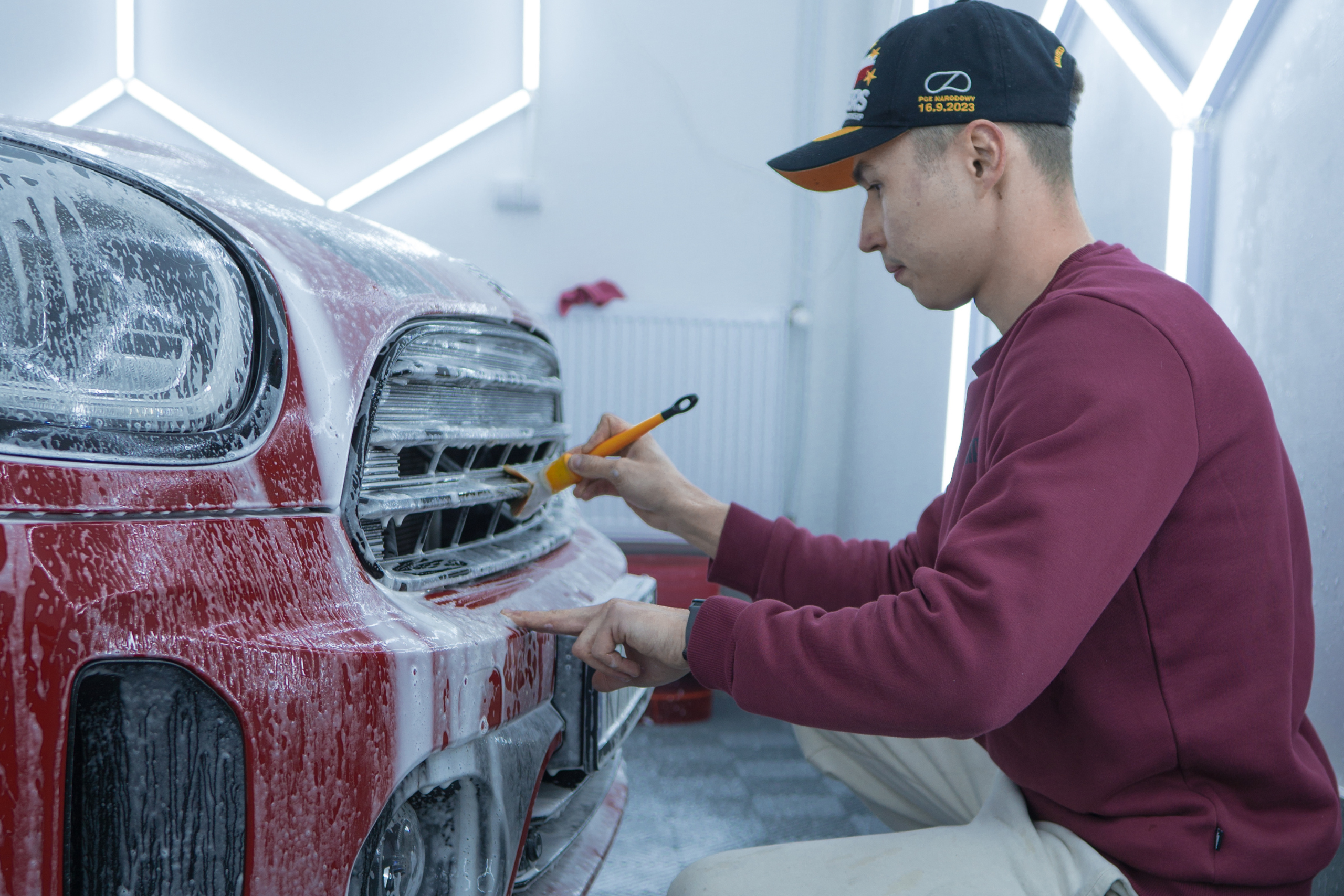 Zanim przystąpimy do właściwego mycia, dokładnie oczyszczamy powierzchnię pojazdu za pomocą myjki ciśnieniowej i piany aktywnej. Usuwa ona zalegający brud, zaschnięte zanieczyszczenia i błoto, co minimalizuje ryzyko powstawania rys w kolejnych etapach. Piana aktywna działa od 3 do 7 minut, po czym zostaje dokładnie spłukana, zanim zdąży wyschnąć.